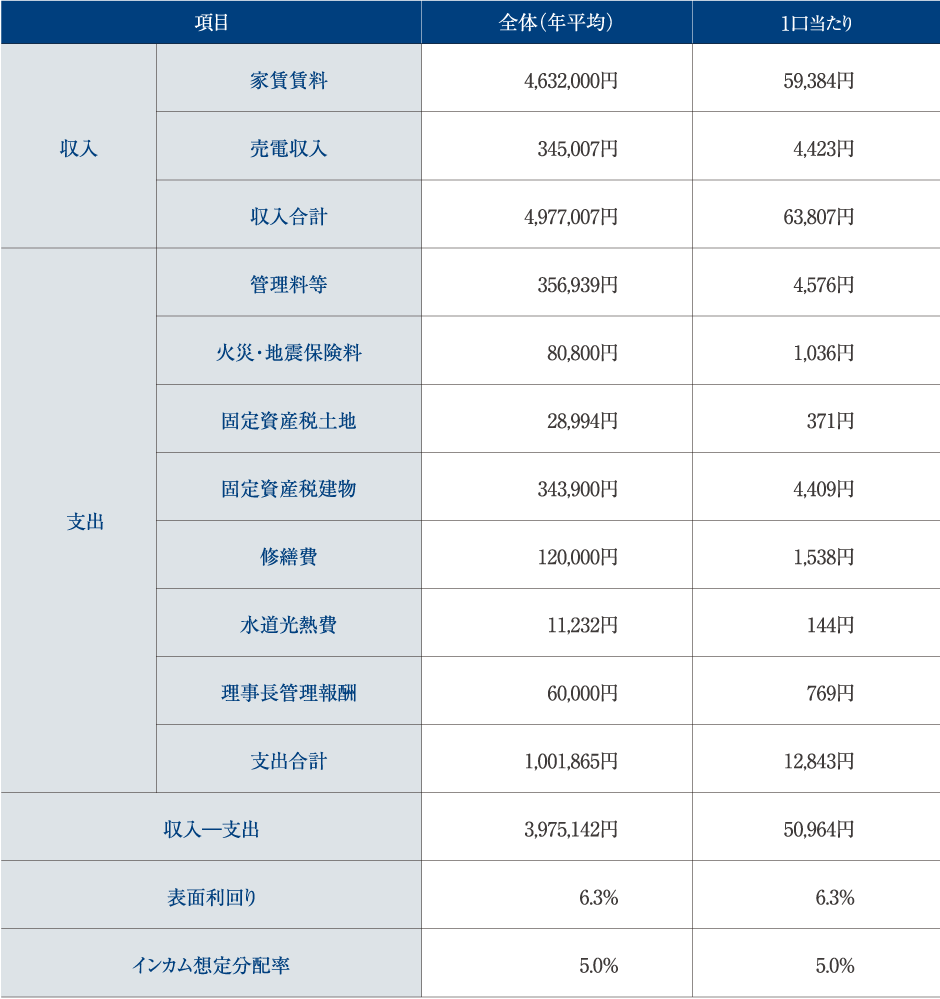 | 想定分配率 | 5.0% 年間現金分配額の募集総額に対する割合。 分配金利回りは想定であり、将来にわたって保証をするものではありません。 |