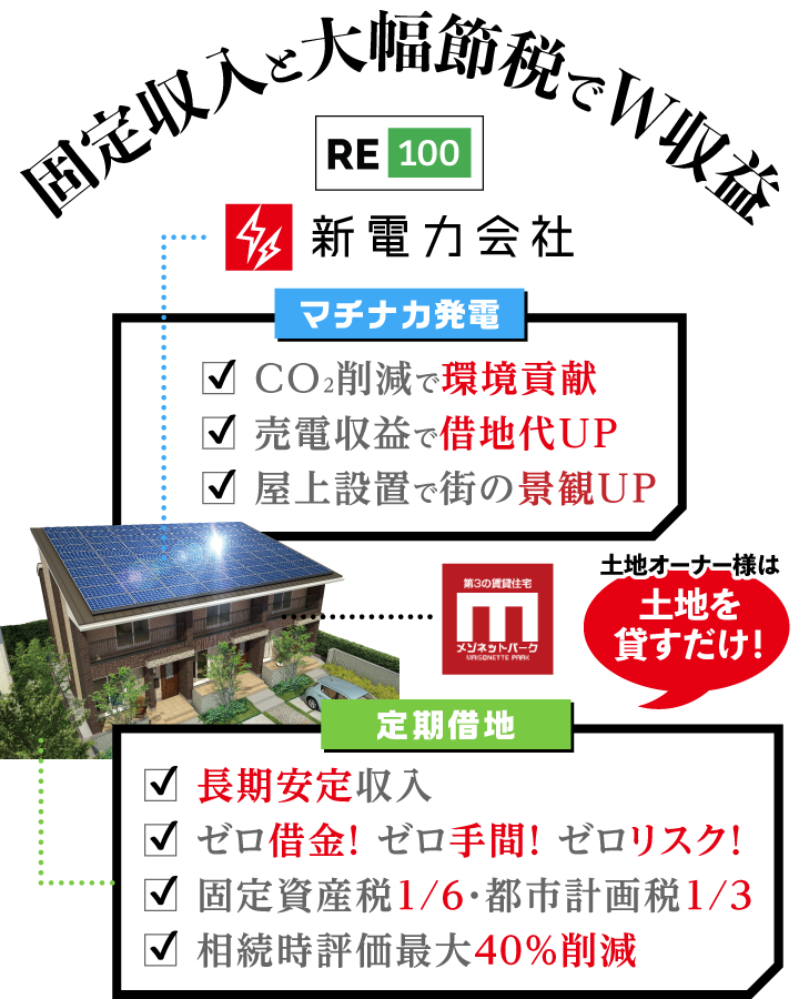 お借りした土地に当社が太陽光発電付メゾネット賃貸住宅を建て、売電収益を還元!