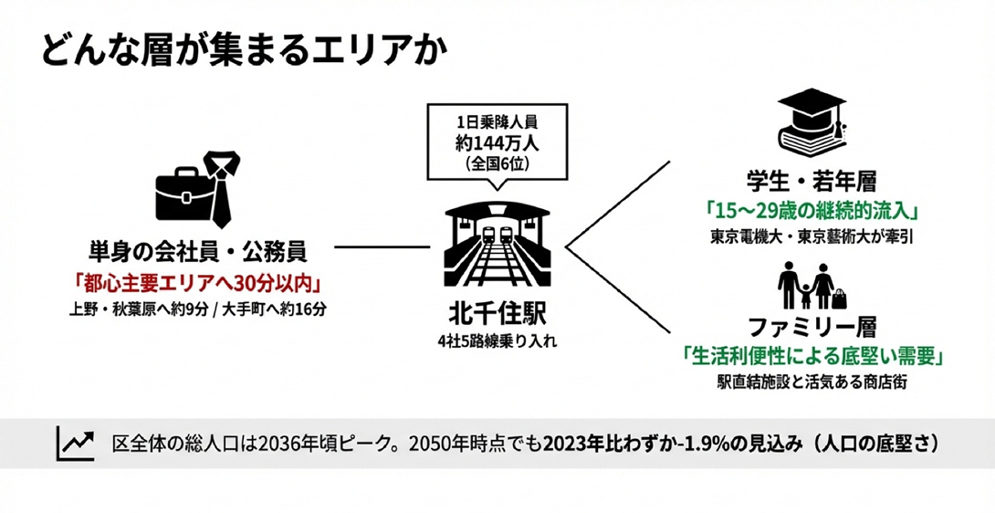東京藝術大学の千住キャンパスも近接しており、アート・文化的な雰囲気を好む若年層にも支持されています。