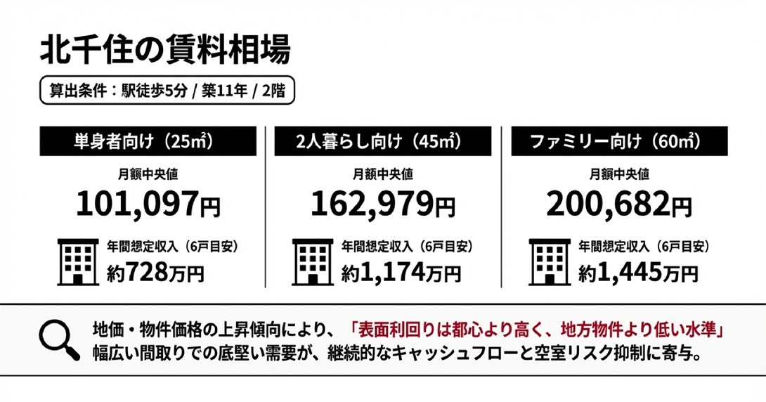 北千住は都心近郊エリアとして地価・物件価格ともに上昇傾向にあるため、表面利回りは都心より高く、地方物件より低い水準に落ち着くケースが多くなります。