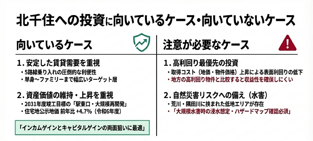 北千住は安定した賃貸需要と再開発による将来性を兼ね備えた、都心近郊エリアの有力な投資候補です。