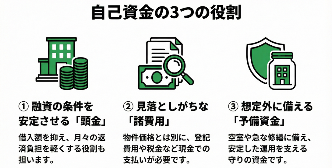 一棟アパート投資における自己資金には、主に以下の3つの役割があります。