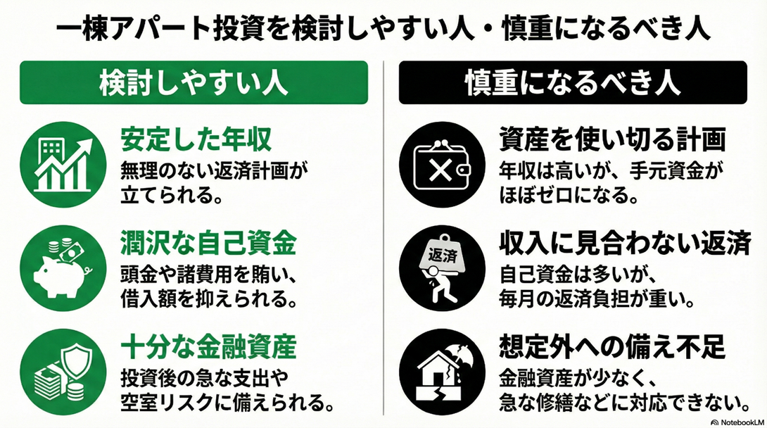 自身が1〜2億円規模の一棟アパート投資を検討すべき段階にあるのかを冷静に見極めるための材料として活用してください。
