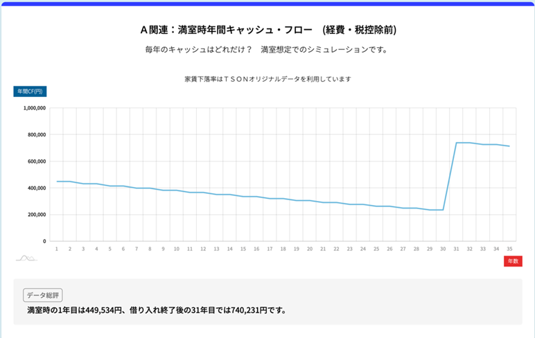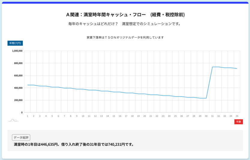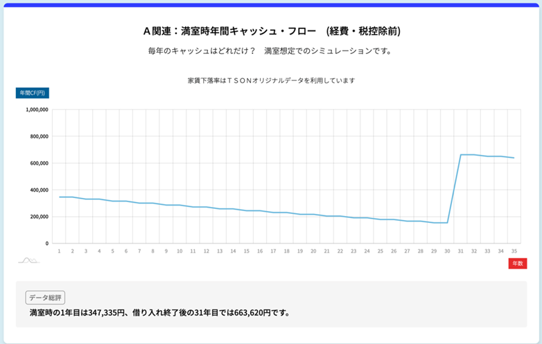 キャッシュフローは年を追うごとに緩やかに減少し、完済後に再び大きく伸びる構成となっています。