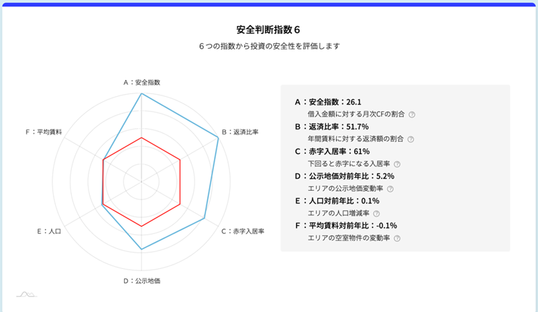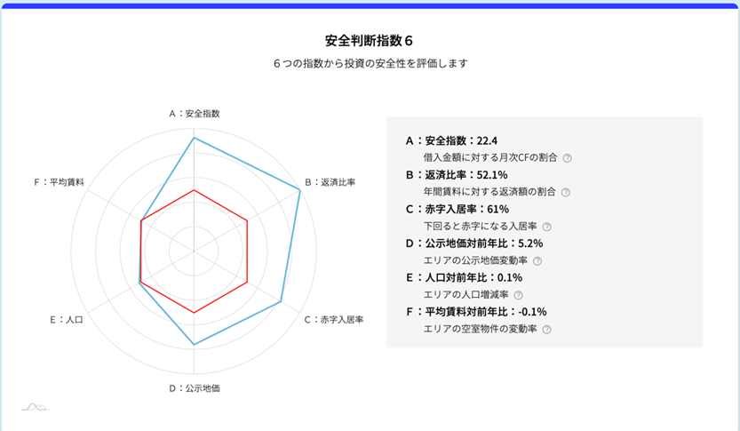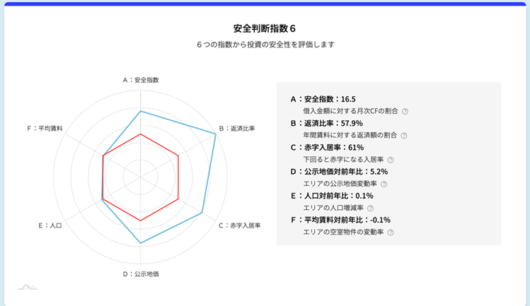 安全判断指数6は、投資を構成する以下の6つの観点をレーダーチャートで可視化したものです。