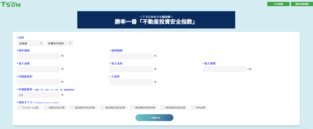 使用するのはTSONが提供しているシミュレーター『勝率一番「不動産投資安全指数」』です。