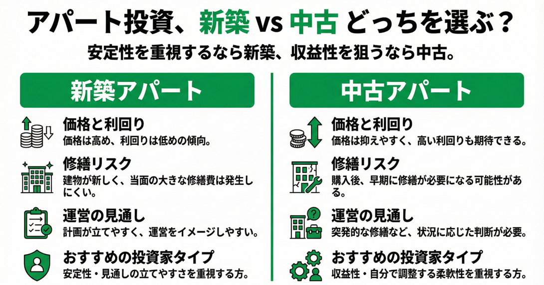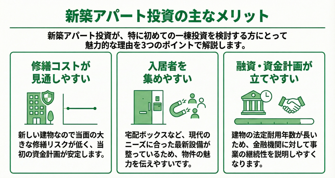 - 新築アパート投資は修繕費や運営の見通しを立てやすく、初めて一棟投資を検討する人にとって安心感のある選択肢
