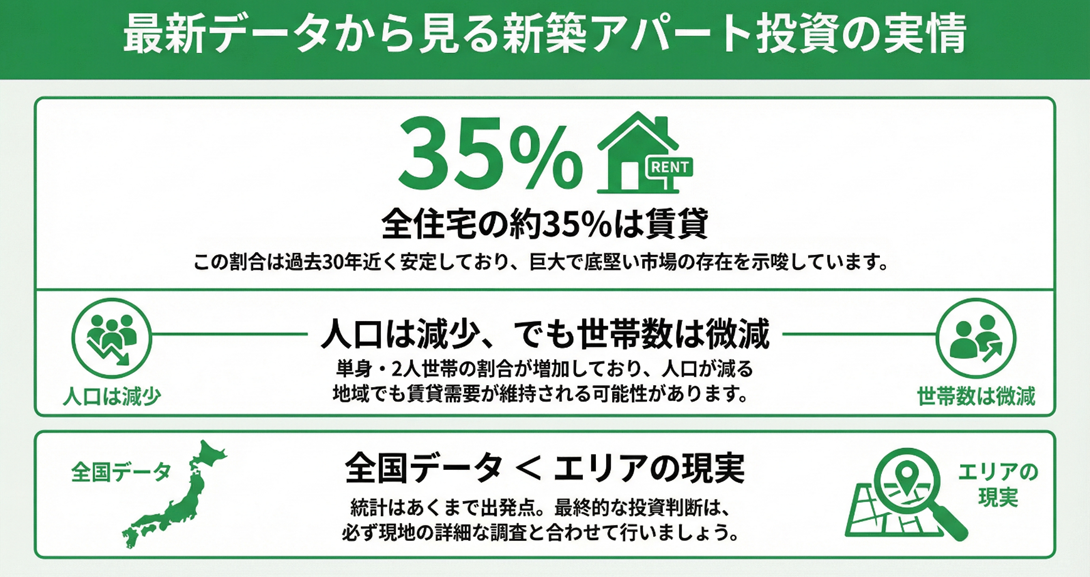 - 賃貸住宅市場は一定規模で存在しているものの、最終的な判断はエリアや投資目的に左右される