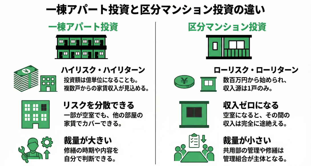 このように、一棟アパート投資と区分マンション投資では、収入の安定性やリスクの考え方、運営負担の大きさなどが大きく異なります。