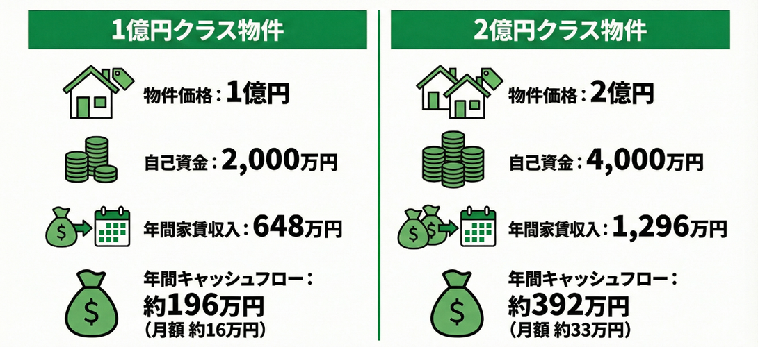 2億円クラスでは、物件規模の拡大により家賃収入・キャッシュフローともに金額が大きくなります。