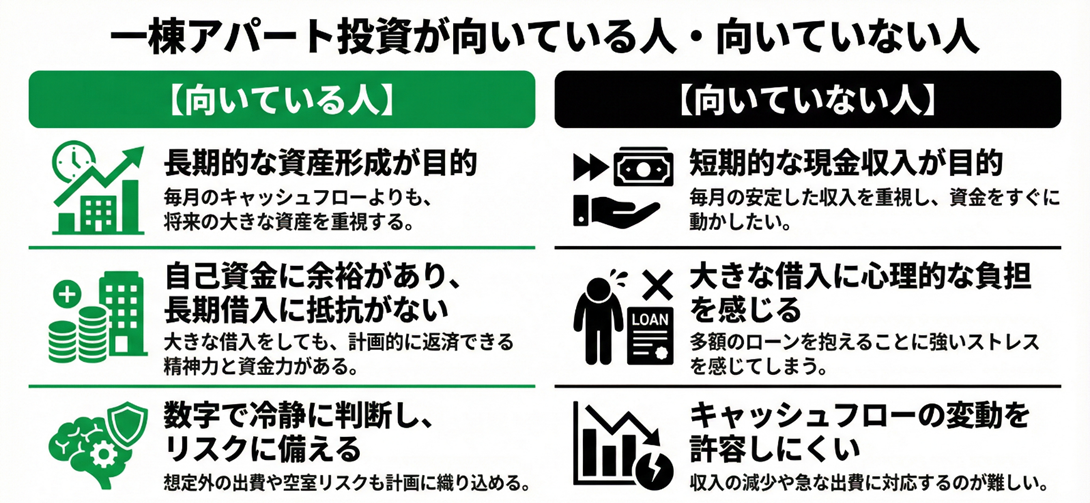 一方で、一棟アパート投資が必ずしもすべての人に適しているわけではありません。