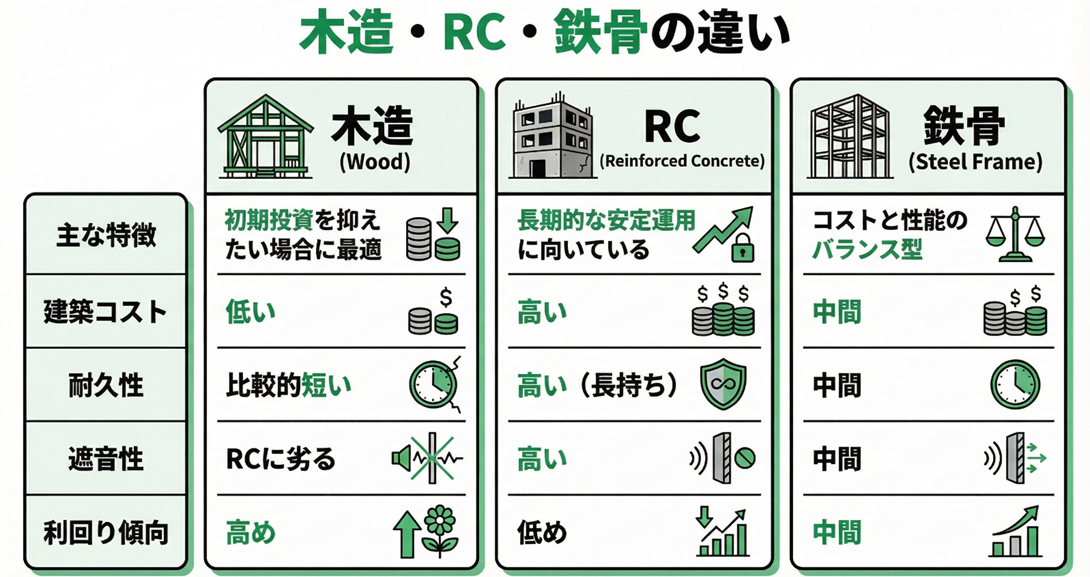 - 木造・RC・鉄骨はそれぞれ、投資効率や融資条件、売却時の考え方などが異なり、単純な優劣では判断できない
