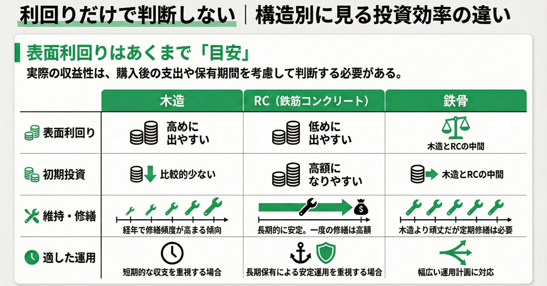 そのため表面利回りだけを見ると、「木造の方が投資効率が良い」と感じるかもしれません。