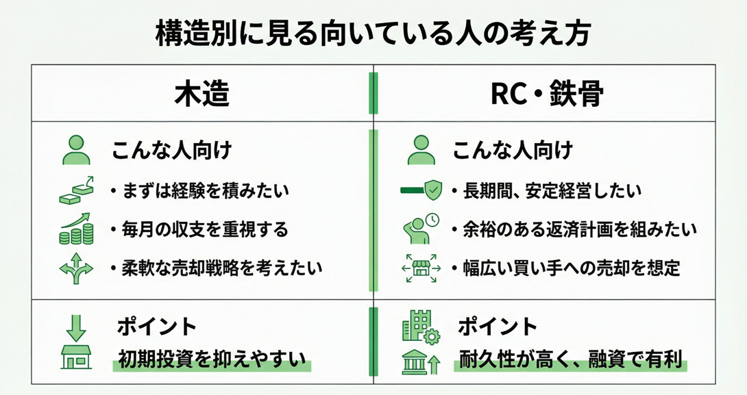 ここで迷いが生じやすい理由は、建物の構造が収支だけでなく融資条件や将来の売却にも関わってくるためです。
