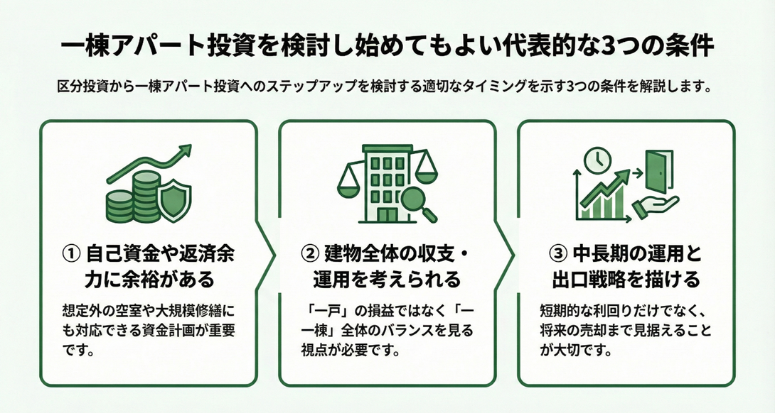 今すぐ進むべきか、まだ区分投資を続けるべきかを二択で決めるのではなく、どのような状態になったときに一棟投資が選択肢として現実的になるのかを確認していきましょう。