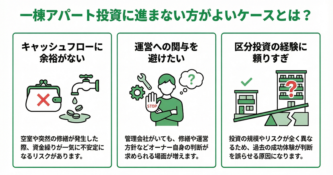 ここでは、区分投資からのステップアップを検討する際に、一棟アパート投資に進まない方がよいケースを整理します。
