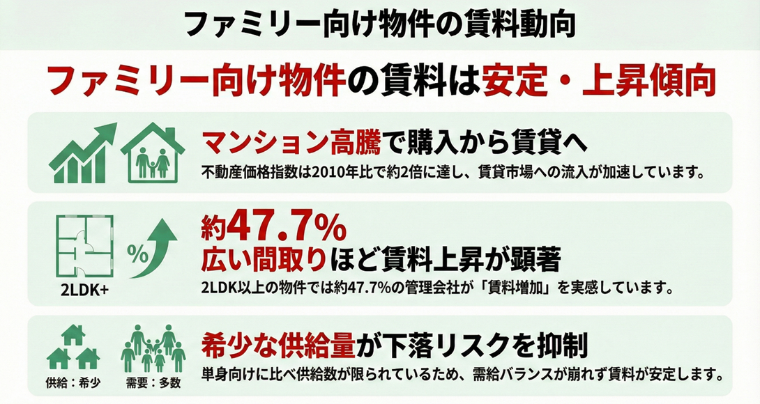 これらの要因が重なったことで、ファミリー向け賃貸物件は単身向け物件と比較して賃料下落リスクが低く、安定した収益を見込みやすい状況が続いています。