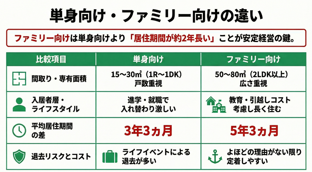 - ファミリー向け物件は平均居住期間が単身向けの約1.6倍と長く、入れ替えコストを抑えた安定経営を行いやすい