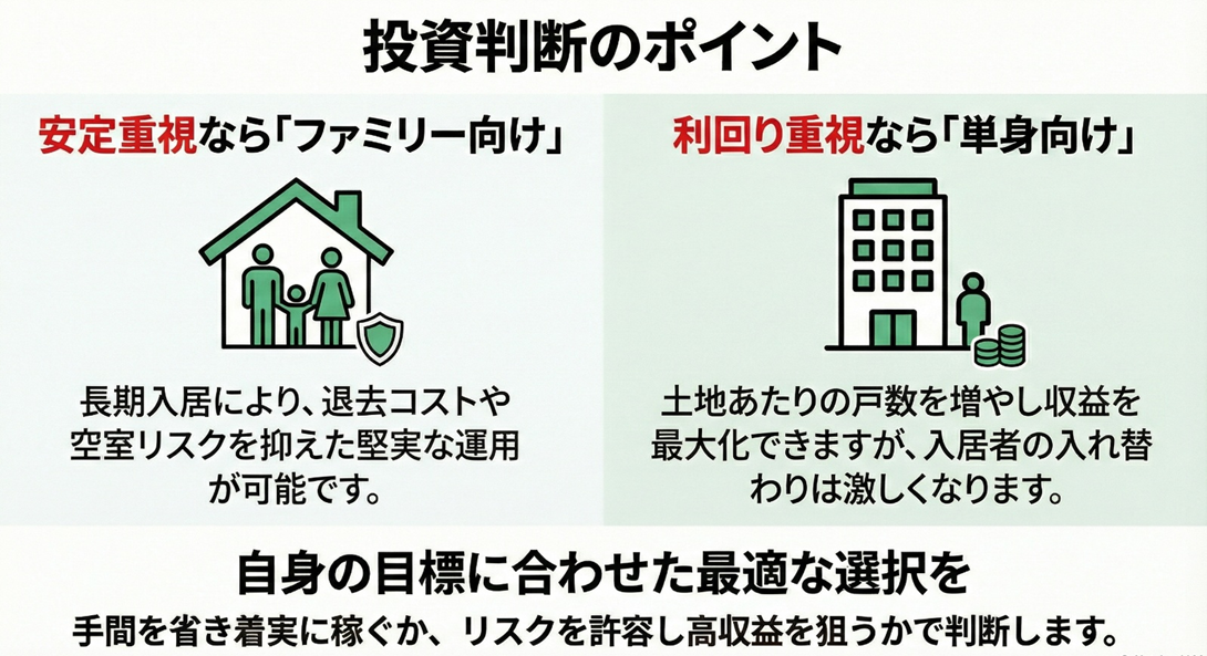 一棟アパート投資において、単身向けとファミリー向けのどちらを選ぶかは、投資成果を左右する重要な判断です。