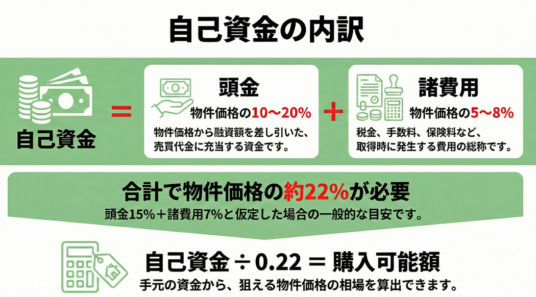 一棟アパートを取得する際の自己資金は、大きく分けて「頭金」と「諸費用」の2つに充当されます。