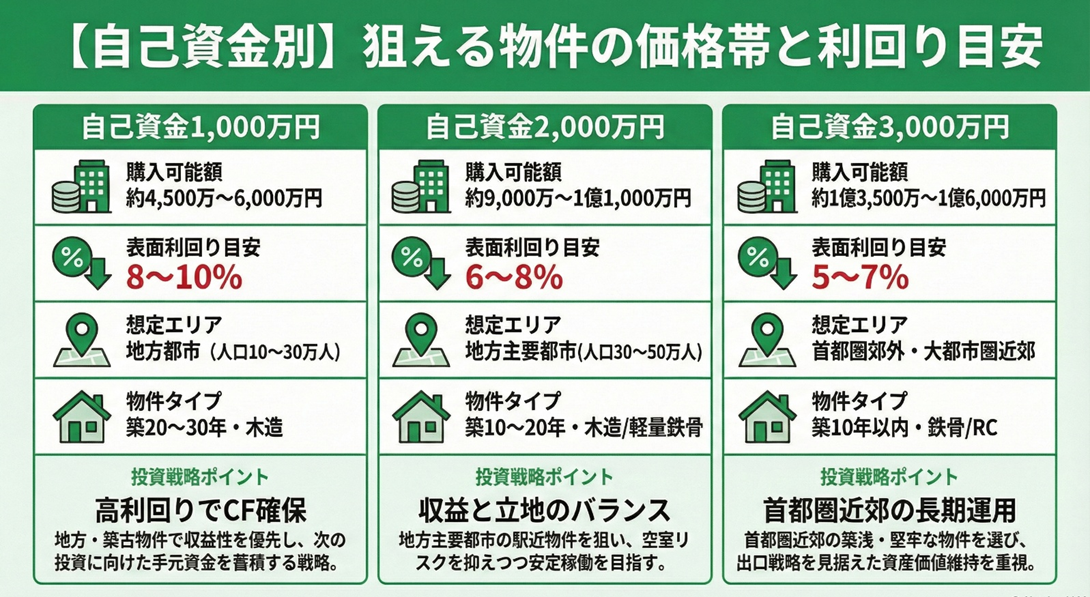 - 頭金1,000万円なら利回り8〜10%の地方物件、2,000万円なら6〜8%のバランス型物件、3,000万円なら5〜7%の資産性重視物件が目安となる