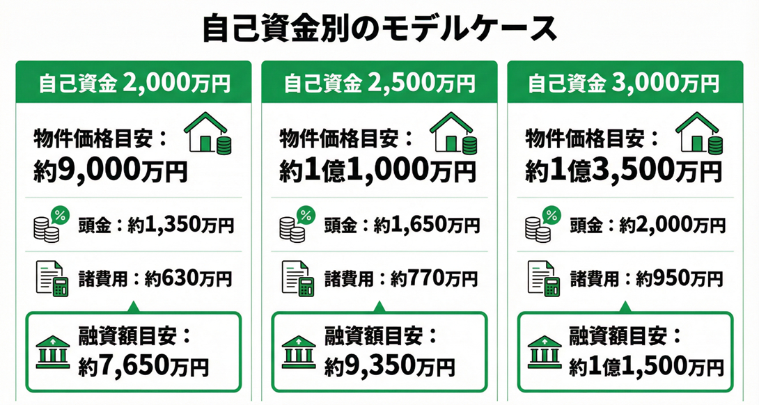 - 自己資金2,000万〜3,000万円であれば、融資条件次第で7,000万〜1億5,000万円程度の物件取得が視野に入る