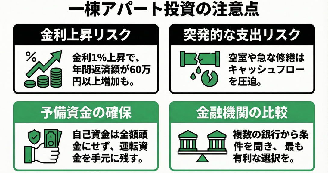 一棟アパート投資では、空室の発生や突発的な修繕費用など想定外の支出が生じることがあります。