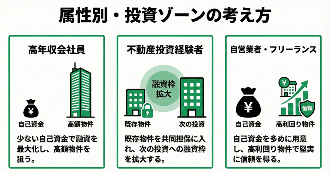 ここでは、代表的な3つの属性パターンにおける最適な投資ゾーンの考え方を解説します。