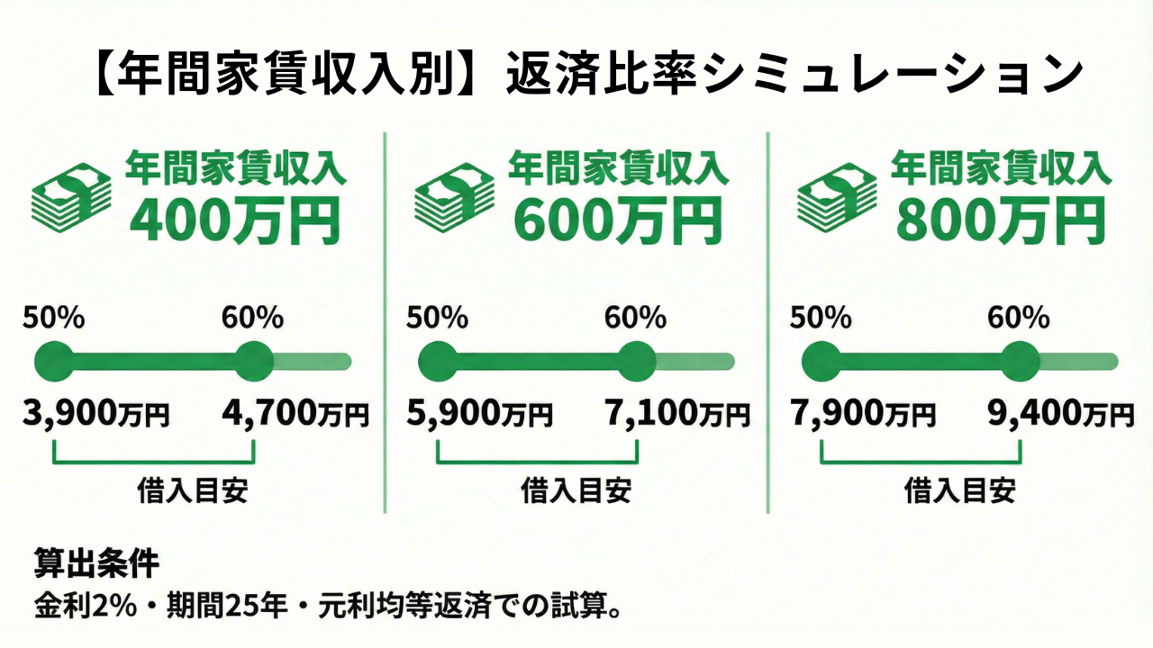 年間家賃収入400万円(月々約33万円)の物件の場合、返済比率50%であれば年間返済額は200万円(月々約16.7万円)となり、この条件での借入可能額は約3,900万円が目安です。