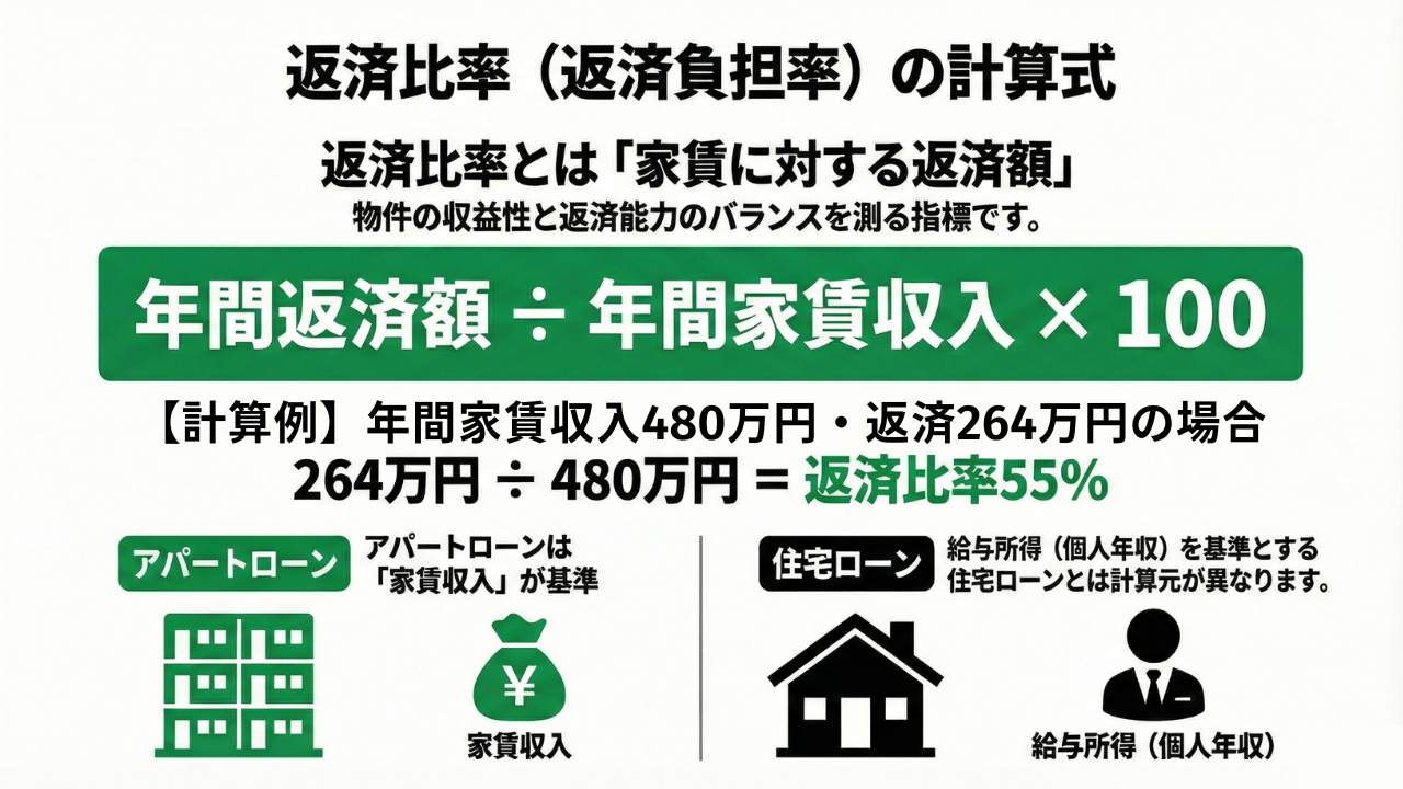 - 返済比率は年間返済額÷年間家賃収入で算出され、アパートローン審査における重要な指標となる