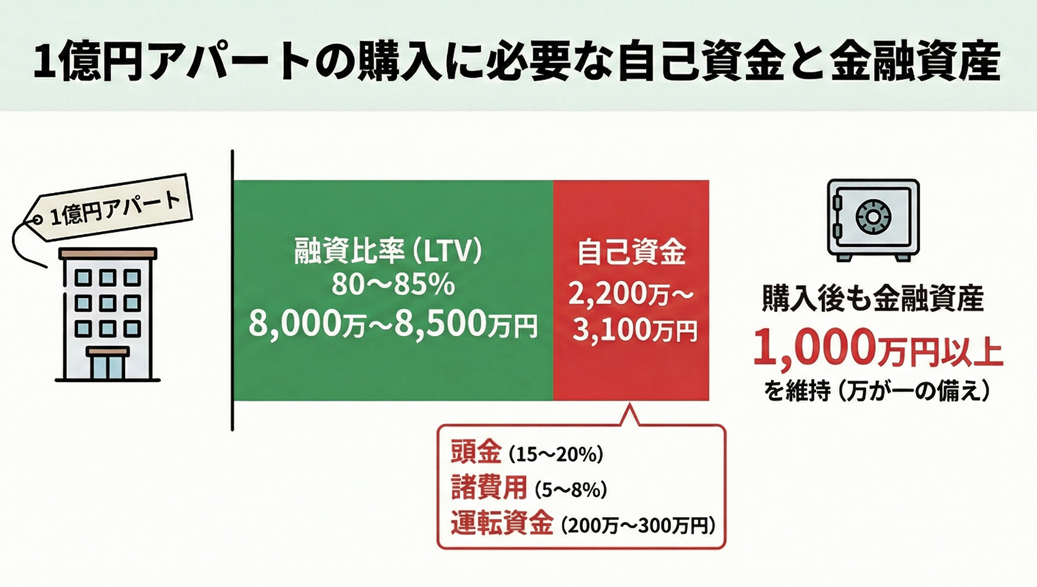 - 1億円の一棟アパート購入には、頭金・諸費用・運転資金を含めて2,200万〜3,100万円程度の自己資金が必要