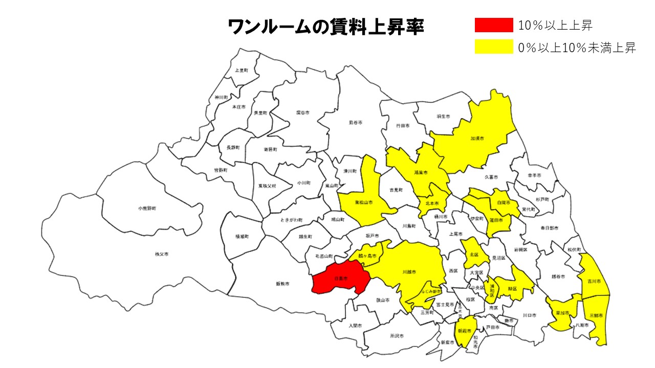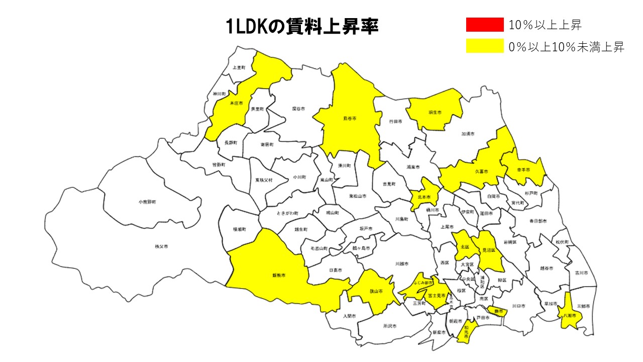 1LDKは富士見市(+7.87%)、久喜市(+5.00%)、羽生市(+3.33%)などで上昇が見られる。