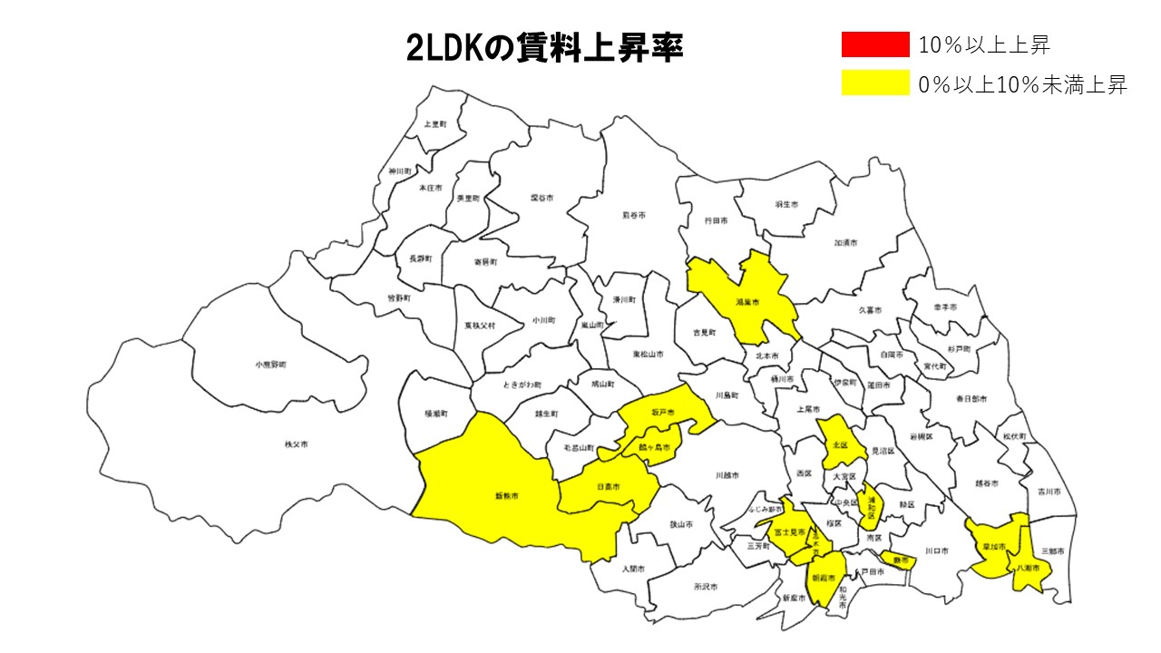 ふじみ野市(+2.35%)や蕨市(+1.96%)も小幅に上昇し、県全体で安定した上昇傾向を示した。