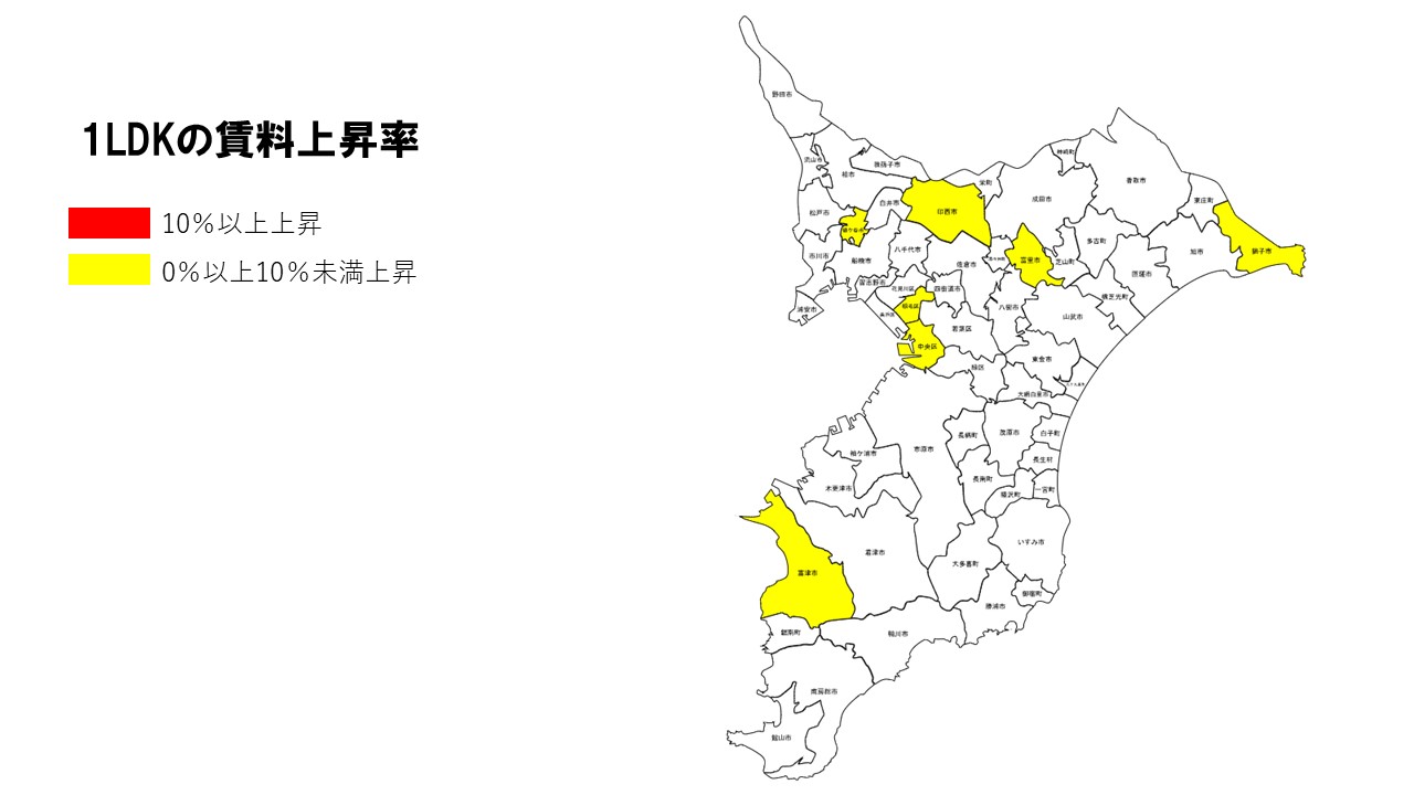 1LDKは銚子市(+3.12%)がトップとなり、富里市(+1.64%)、富津市(+1.54%)が続いた。