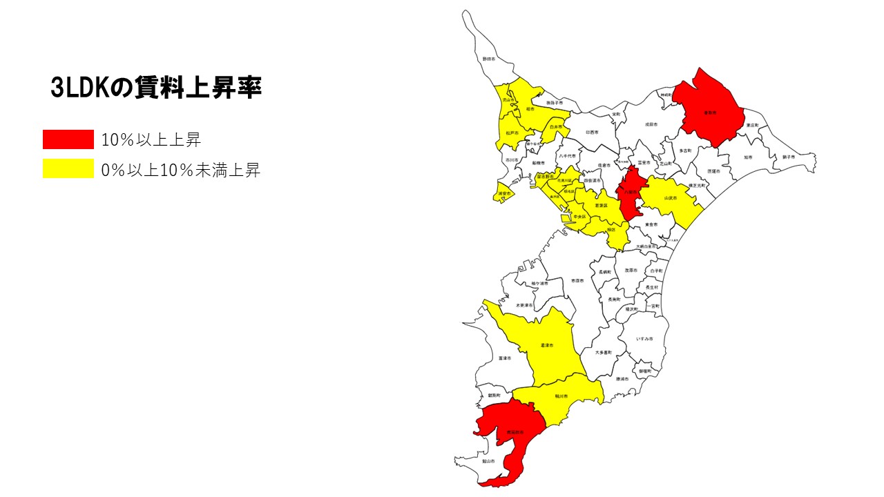 3LDKは上昇幅が特に大きく、八街市(+20.83%)が突出した。