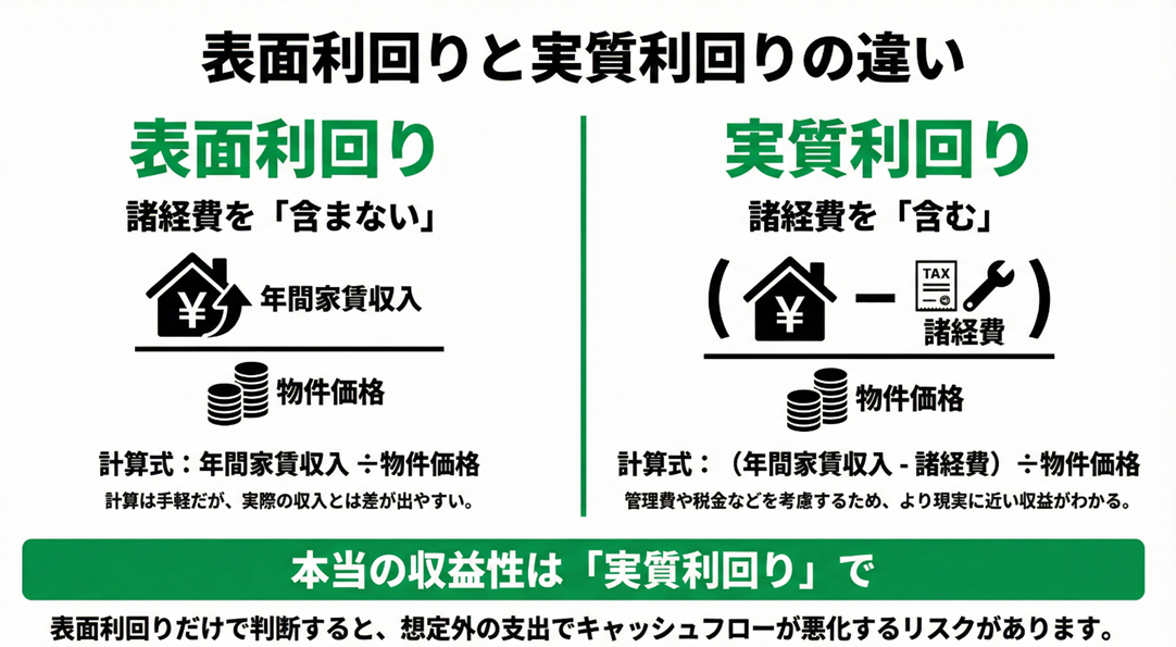 この528万円を物件価格1億円で割り戻すと、実質利回りは約5.3%となり、表面利回り(7.2%)とは大きな差があることが分かります。