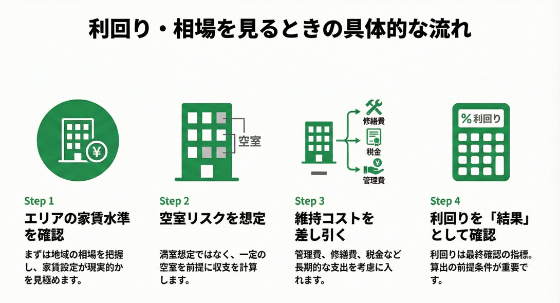 - 相場や利回りは、エリアの家賃水準→空室リスク→維持コストの順に整理し、最後に実質利回りで確認することが重要