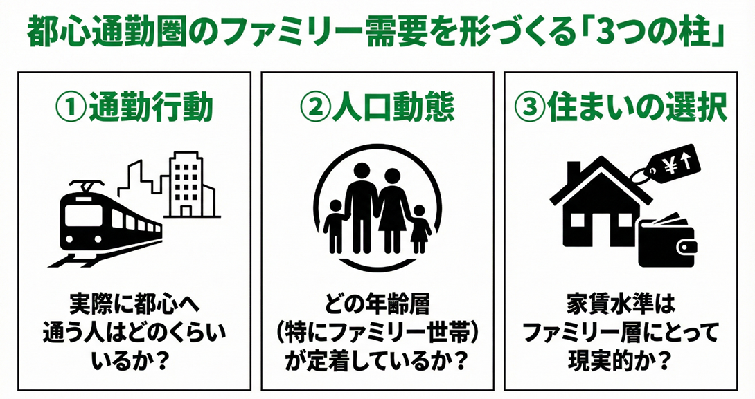 ここではこの3つの柱を順に確認しながら、都心通勤圏におけるファミリー需要の「持続性」を読み解いていきましょう。