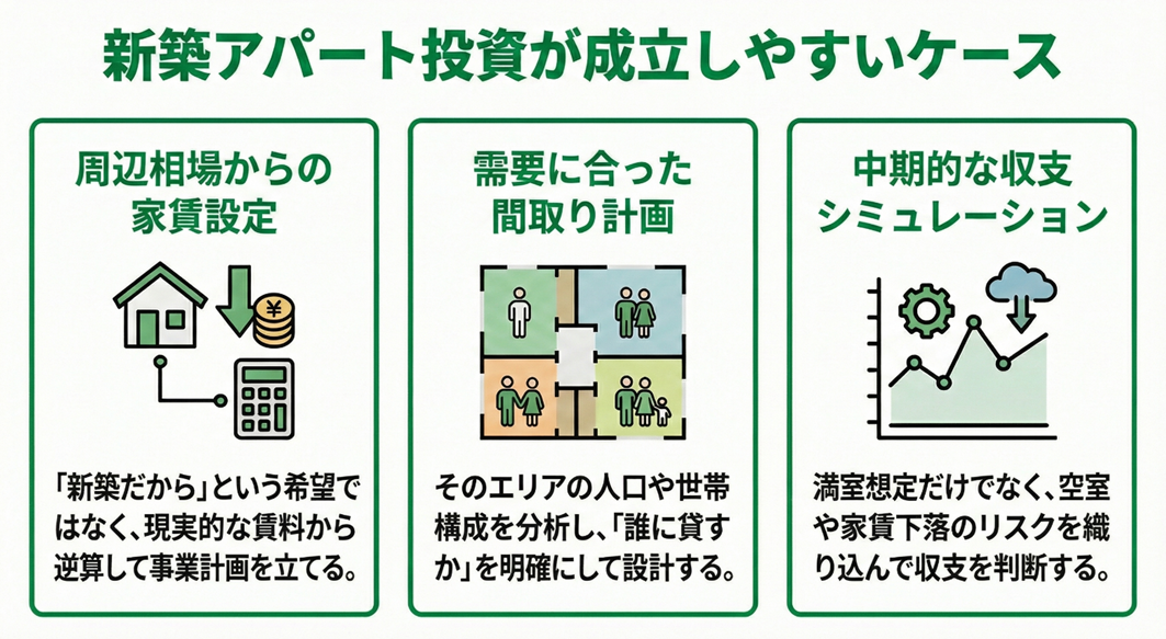 ここでは、新築アパート投資のなかでも、比較的成立しやすいと考えられるケースを整理します。