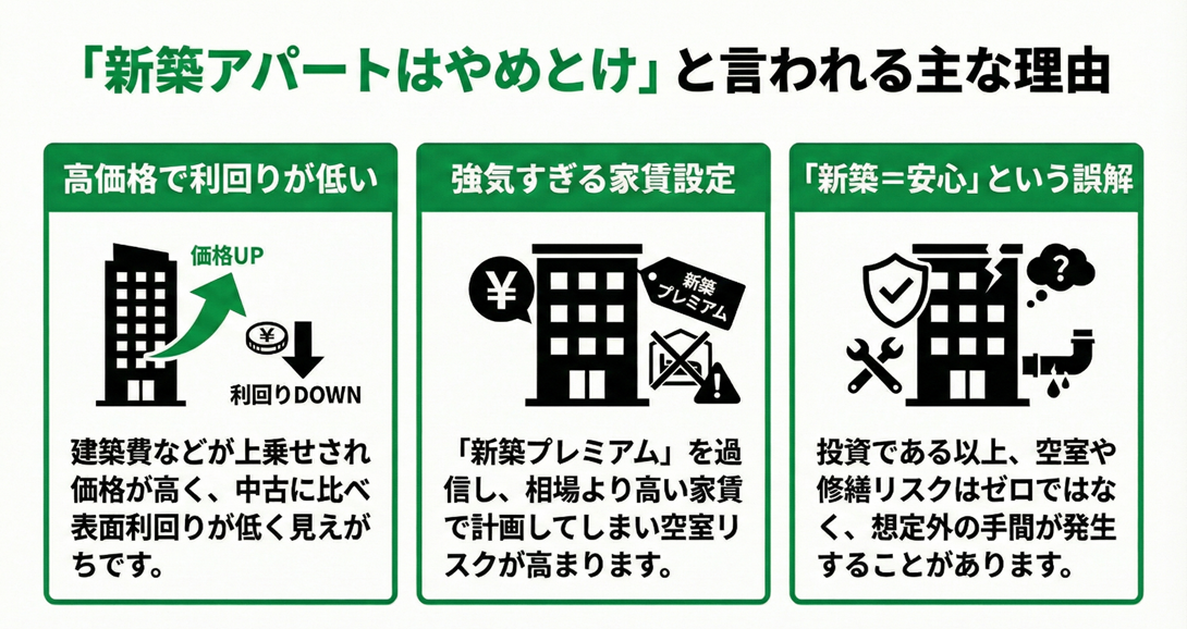 「新築アパートはやめとけ」と言われる背景には、いくつか共通した論点があります。