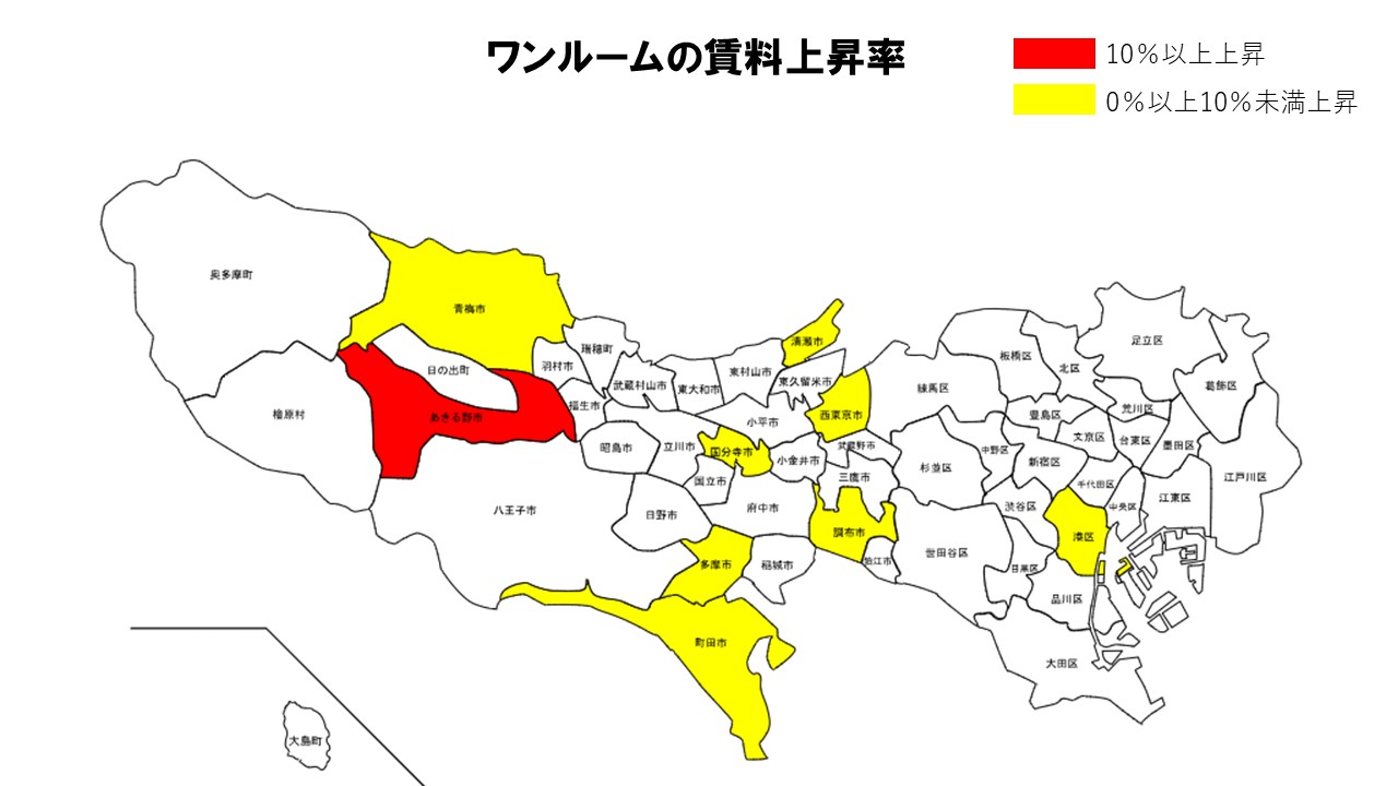 2025年12月の東京都ワンルーム平均賃料は、あきる野市が最も大きく上昇した。
