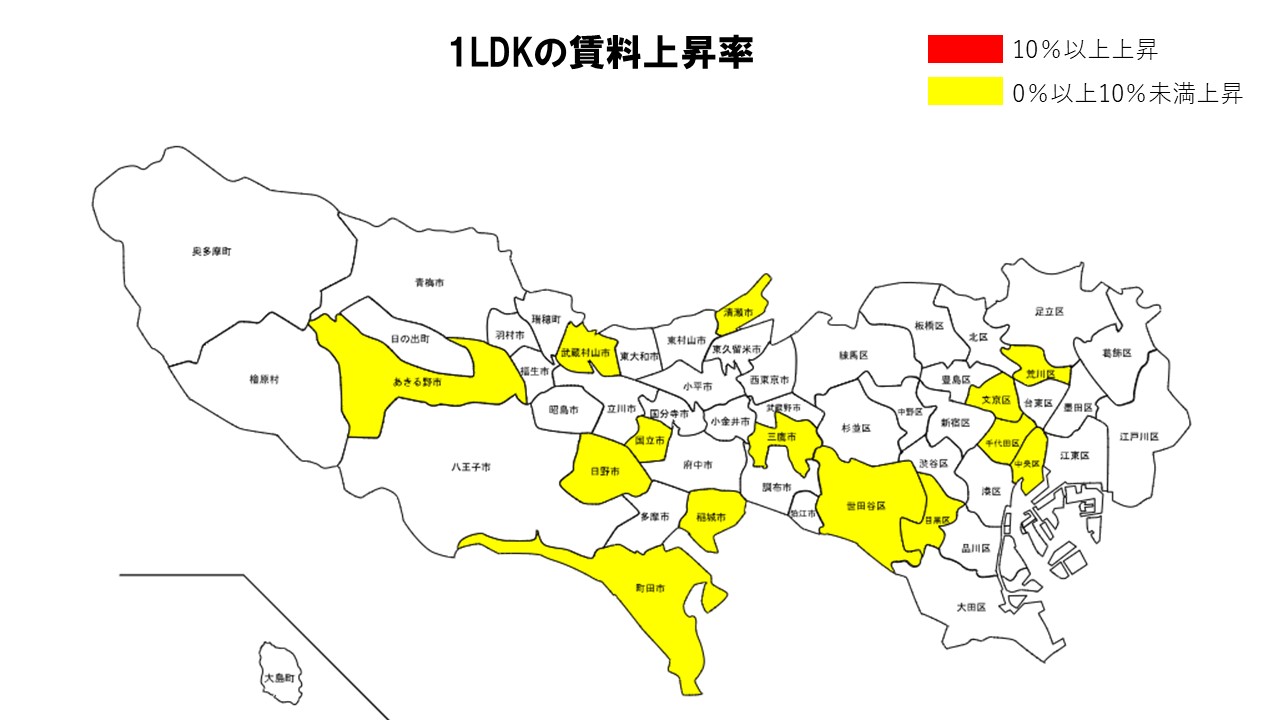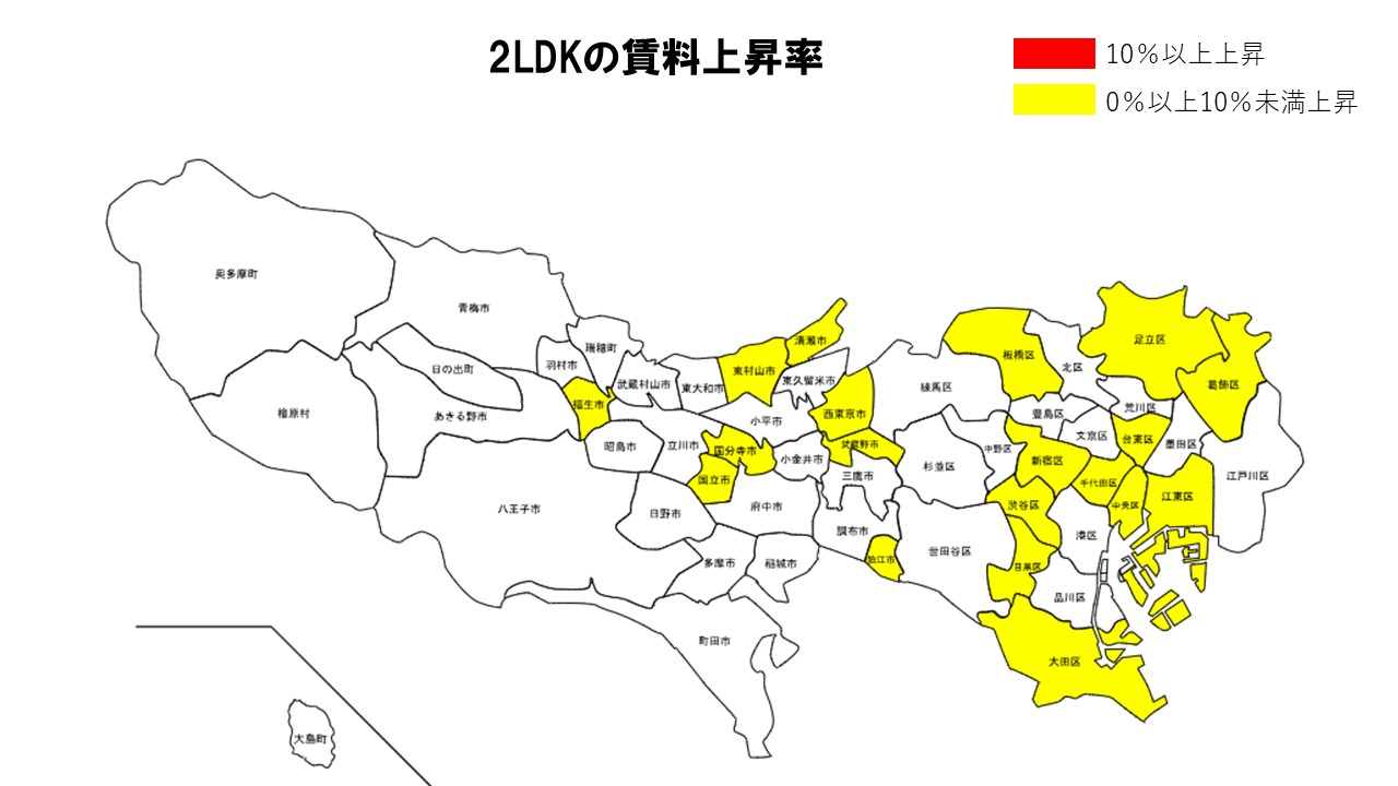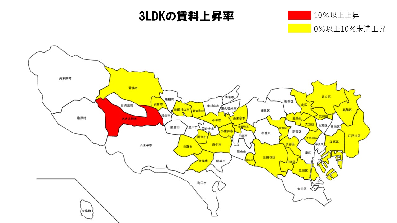 板橋区や多摩市でも上昇が確認され、ファミリー向け間取りでは郊外を中心に賃料上昇が顕著となった。