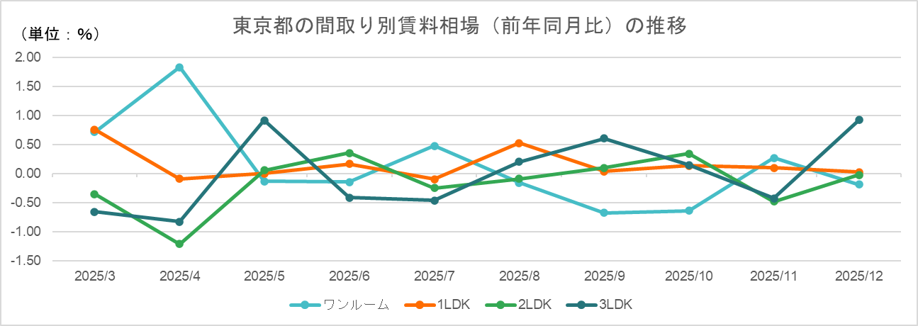 単身者向けからファミリー向けまで幅広い間取りでプラス圏を維持しており、東京都全体として底堅い賃料相場が続いている。