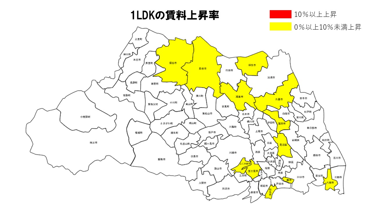 不動産AIの「勝率一番」による、埼玉県の賃料上昇ランキングをご紹介。昨年同月比でそのエリアの賃料がどのぐらい変動したかを調べている。