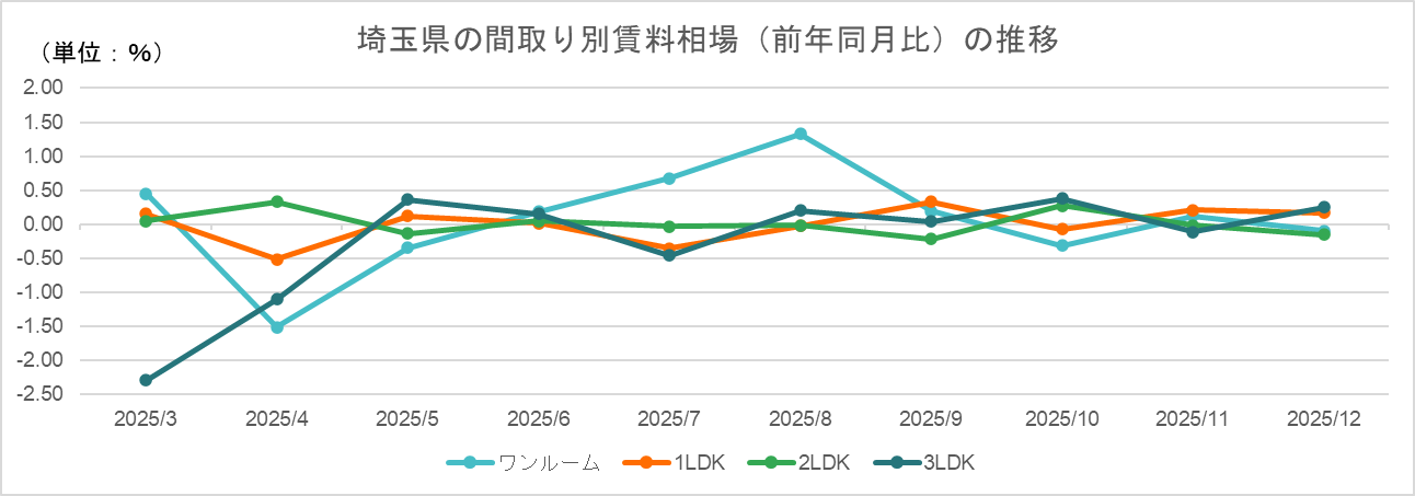11月に続き、12月も埼玉県では賃料の上昇傾向が確認された。