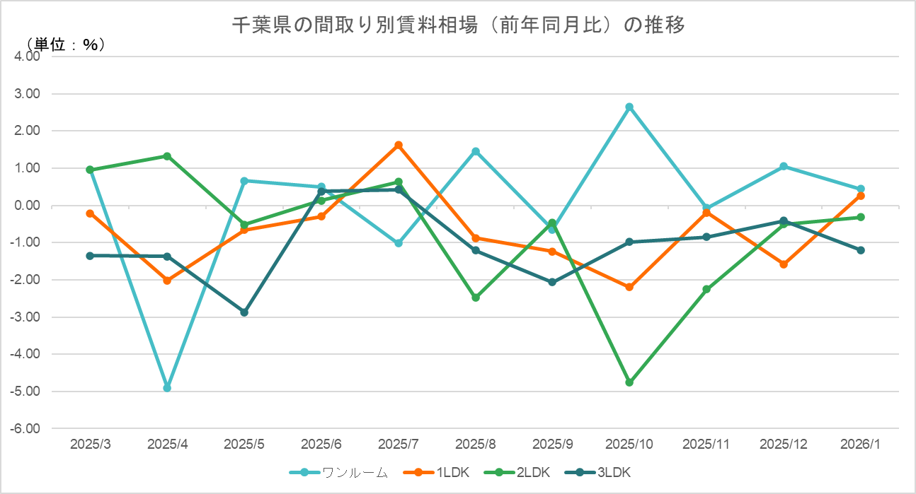 2026年1月の千葉県は、ワンルームが前年比+0.44%、1LDKが+0.27%とプラス圏を維持した一方、2LDKは-0.31%、3LDKは-1.20%とファミリー向け間取りのマイナスが続いた。
