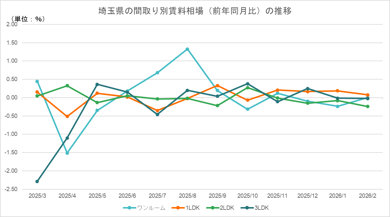 2026年2月の埼玉県は、1LDKが+0.07%とプラス圏を維持し、ワンルームも前月のマイナスから0.00%へと回復した。