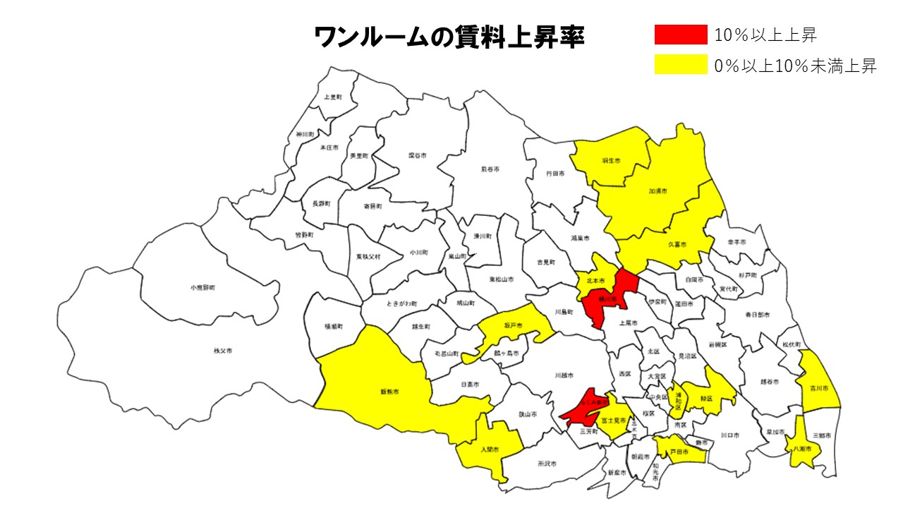 2026年2月の埼玉県ワンルームでは、ふじみ野市が前年比+13.95%と突出した上昇を見せ、桶川市(+10.71%)、加須市(+7.69%)、さいたま市浦和区(+7.58%)が続いた。
