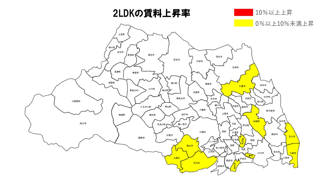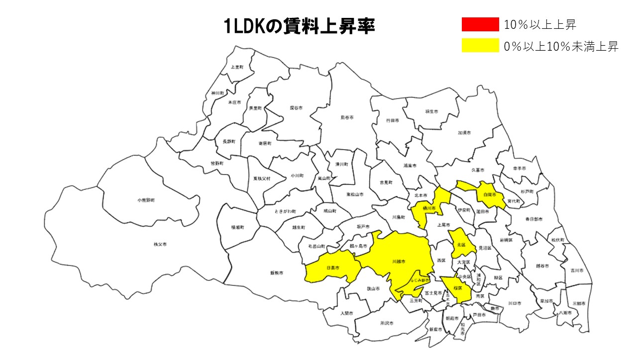 1LDKは桶川市が前年比+2.82%でトップとなり、日高市(+1.59%)、白岡市(+1.37%)、川越市(+1.27%)、さいたま市桜区(+1.25%)が続いた。