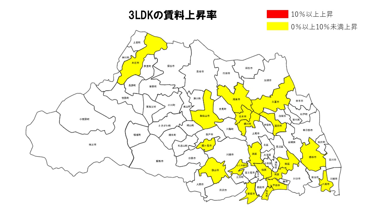 3LDKは本庄市が前年比+8.70%と大きく上昇してトップとなり、蓮田市(+3.31%)、鴻巣市(+2.56%)、北本市(+2.22%)、鶴ヶ島市(+2.08%)が続いた。